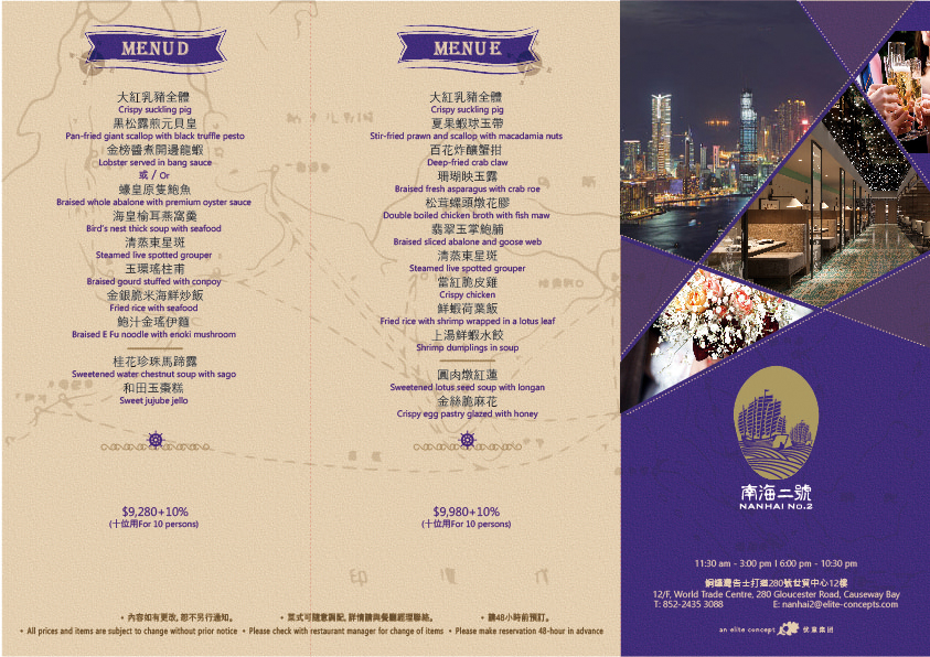 【南海二號】主餐廳可容納150人海景宴會廳,配備最先進會議設施。另設四間私人包其中兩間更可飽覽維港景色。