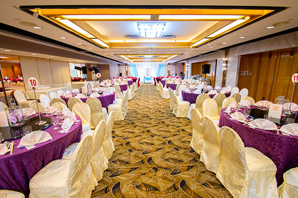 - •宴會廳裝潢豪華典雅,揉合現代經典與慶典風格,以紫色和金色為主調,營造溫馨而華麗的氛圍。