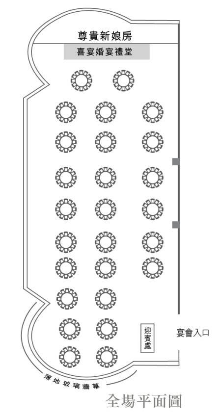 - •宴會廳採無柱式設計,空間寬敞,最多可筵開26席,容納約312位賓客。