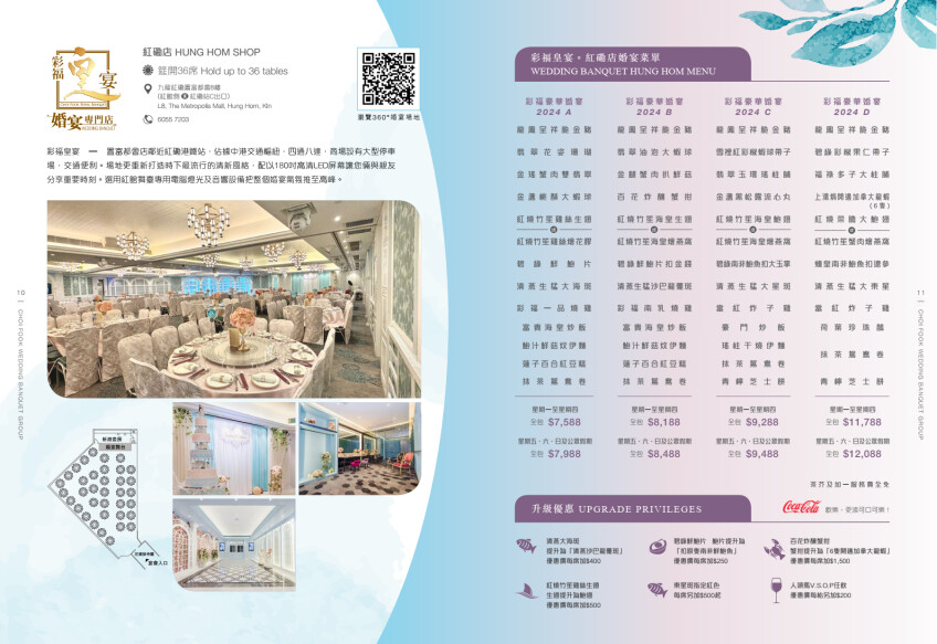 彩福皇宴 – 置富都會店雄據中國、港九新界火車、西鐵、港鐵交通樞紐,盡佔全港優越婚宴地段。耗資1500萬打造6星級婚宴埸地,採用英國舞台專業電腦燈光效果、演唱會專用的Shure無線咪系統寬敞無柱的豪華婚宴場面,筵開36席,璀璨的奧地利水晶燈,令新人及貴賓置身於歐陸醉人的環境。