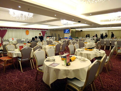 - •宴會廳裝飾融合紅色、米白色調,並配有水晶吊燈、紅色地毯及佈置舞台,營造華麗喜慶氛圍。