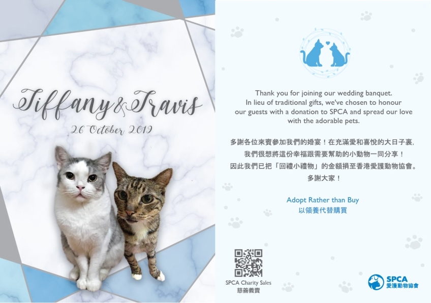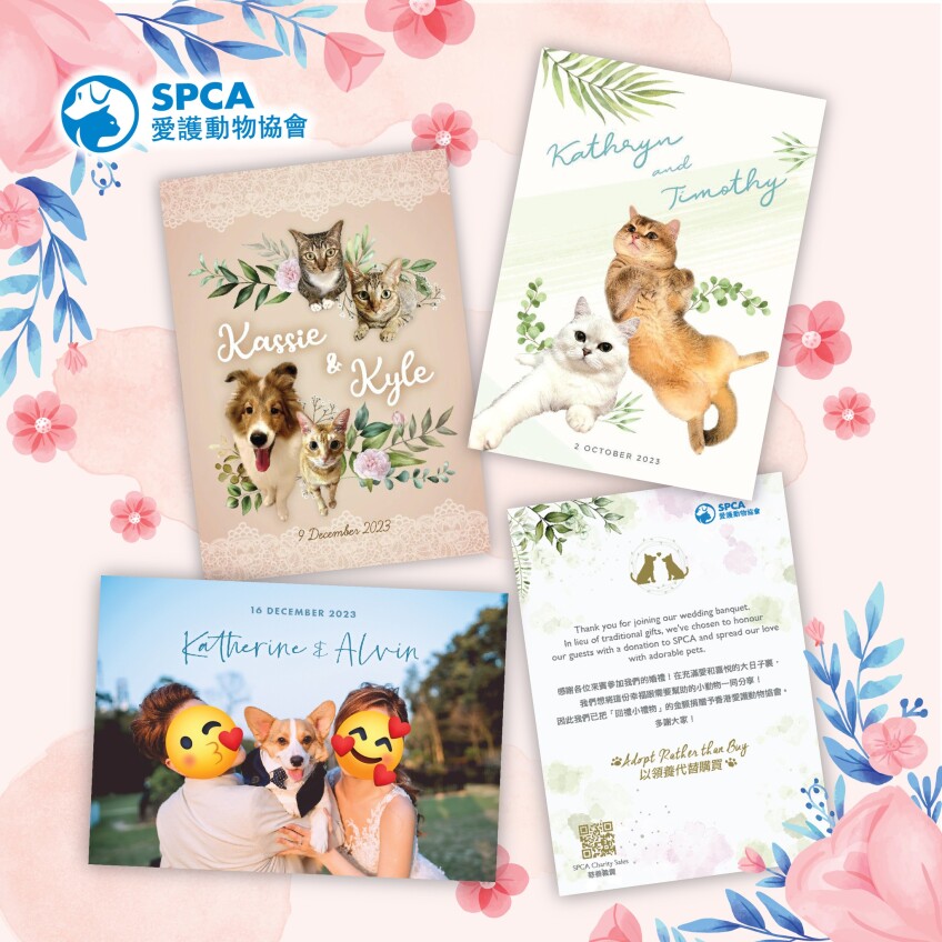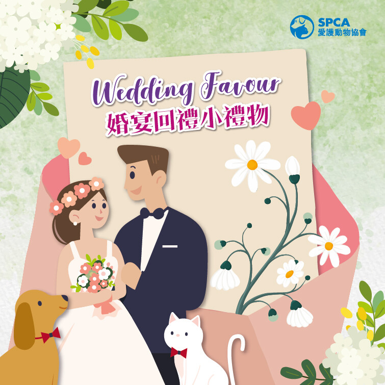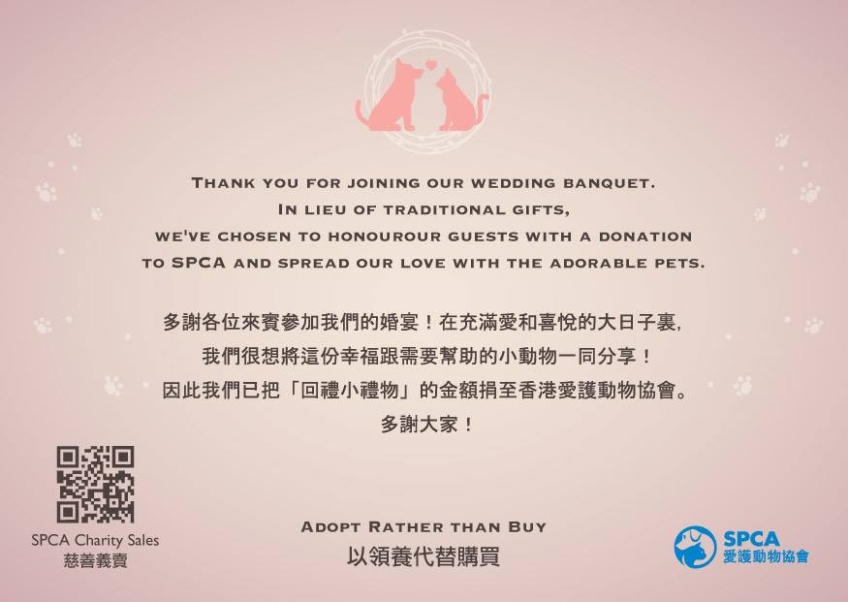 新人可以將回禮款項捐到愛護動物協會,幫助協會內有需要的動物。協會會為一對新人設計婚禮使用的回禮心意卡,讓您向各來賓表示謝意!