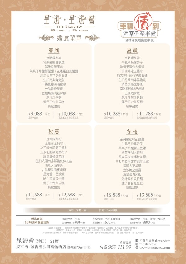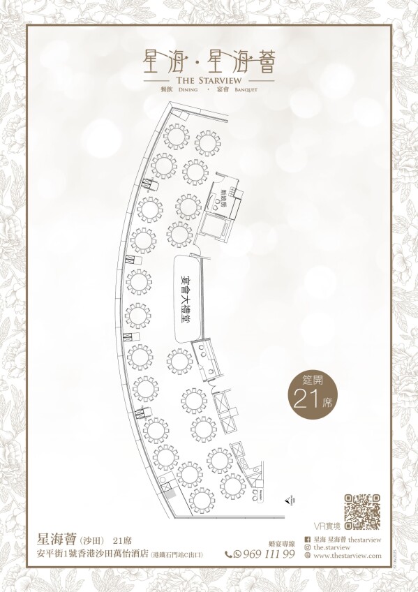 位於沙田萬怡酒店的星海薈裝飾充滿藝術風格,配合別緻的玻璃幕牆沿著宴會廳延伸開去,呈現高貴亮麗的奢華感。金屬感及幾何線條的糅合,配上華麗閃爍的水晶燈以及精雕細琢的細節安排,盡顯尊貴氣派的宴會場地。 星海薈更設有尊貴會所,提供美式桌球及專業卡啦OK音響設施,讓新人和賓客享受奢華消閒體驗。
