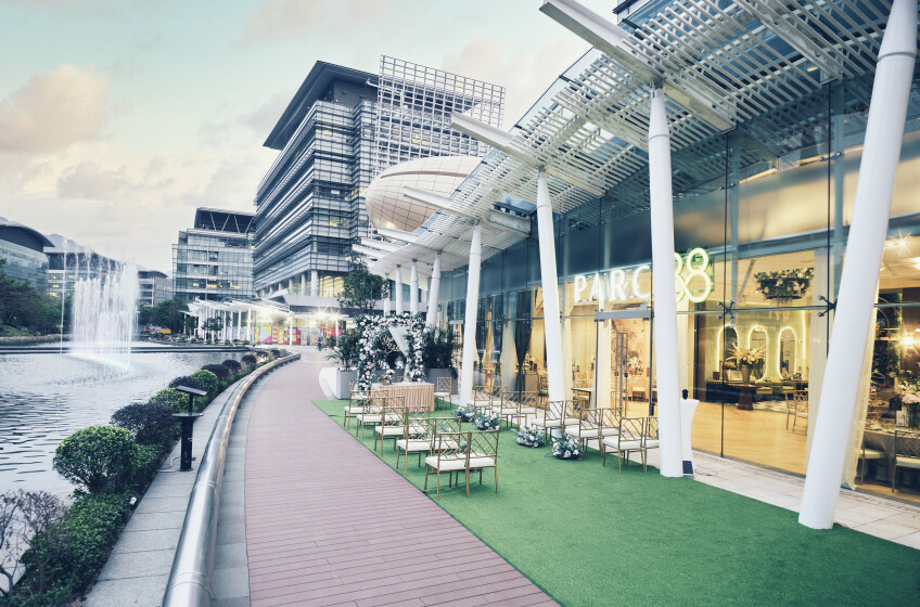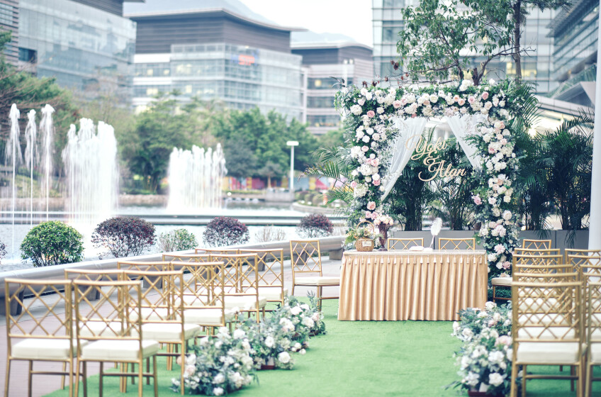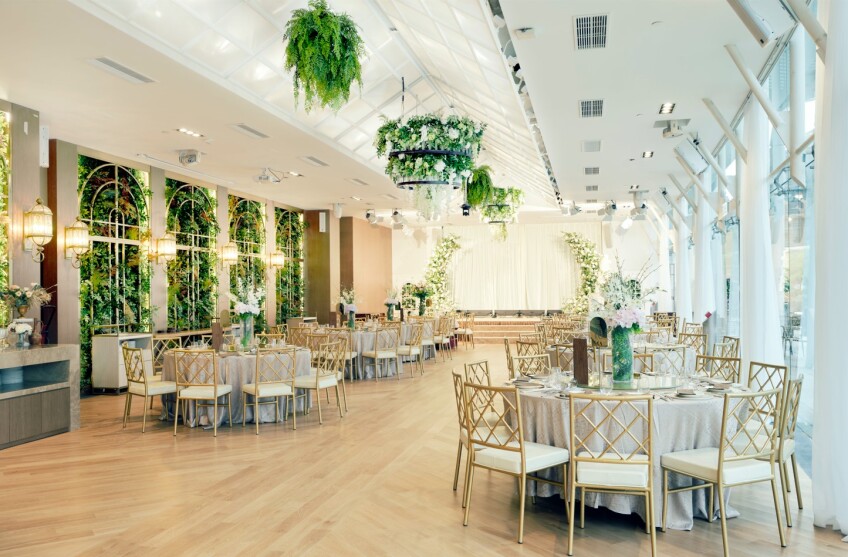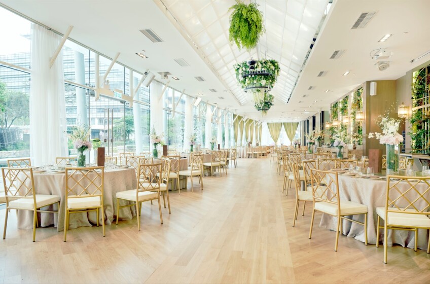 ClubONE PARC88是熱門戶外輕婚禮場地,2024年全新開幕,以森林系風格為主題。宴會廳以田園系玻璃屋作為設計靈感,採光度十足,猶如外國森林婚禮,並設有戶外草地證婚花園,是香港少有的湖畔婚禮證婚場地。