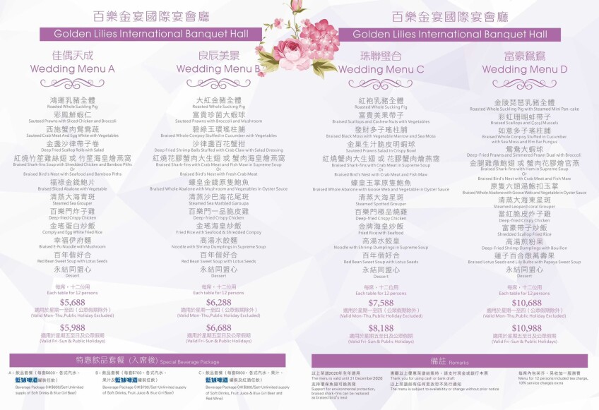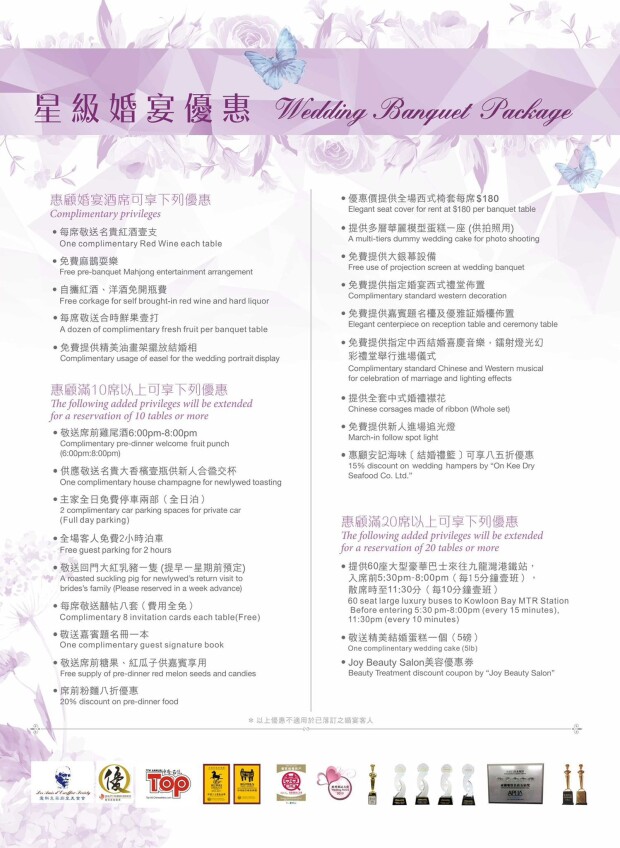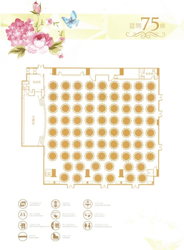 九龍灣百樂門國際宴會廳,採用新穎獨特的室內設計,裝潢精緻細膩,能筵開 75席,給人一種豪華時尚感,與幻變水晶燈拼湊出浪漫醉人的婚宴。