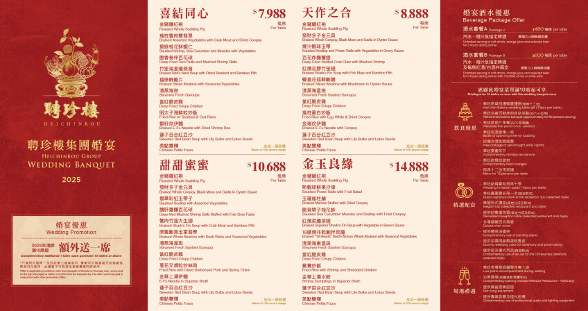 The three Chinese characters of Heichinrou「聘珍樓」, represent “a place welcoming distinguished, good, and wonderful people.” Heichinrou Hong Kong was established in 1988 and are now located at Diamond Hill Plaza Hollywood mall and Kwun Tong Millennium City.
