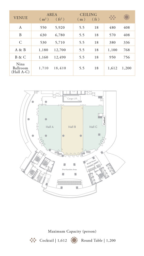 荃灣西如心酒店距離荃灣西地鐵站僅5分鐘步程,鄰近多個大型購物商場,位置優越。作為如心酒店集團的旗艦酒店,荃灣西如心酒店能滿足不同賓客的需求。 位於酒店7樓的Nina Ballroom是全香港最大型的宴會廳之一,裝潢融合時尚設計,配以最先進的影音設備,無論舉行任何慶典或活動,都能締造真摰動人時刻。Nina Ballroom佔地逾1,672平方米(18,000平方呎),可筵開多達百圍盛宴,加上配備可調較場景的天花燈及三個巨型LED幕牆,能營造極致的視覺效果,絕對適合在此實現你的夢幻婚禮。 相連Nina Ballroom的迎賓區空間偌大寬敞,高雅的細節和裝飾完美結合,最適合舉辦席前雞尾酒會,讓親朋好友於開席前聚首一堂,感受浪漫歡慶氣氛。