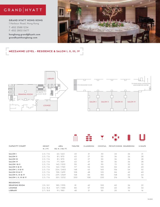 香港君悅酒店共有22間富彈性的活動場地,可舉辦任何大小以至多達888人的盛大婚宴。醉人的結婚蛋糕及精美的婚宴菜單均為大廚親自設計,並由創意十足的花卉團隊為蛋糕以靈巧的手藝添上高貴的花卉佈置。香港君悅酒店的婚宴籌劃團隊不但可靠專注,而且具效率,並擁有豐富的專業知識,確保婚宴能順利成功地舉行。