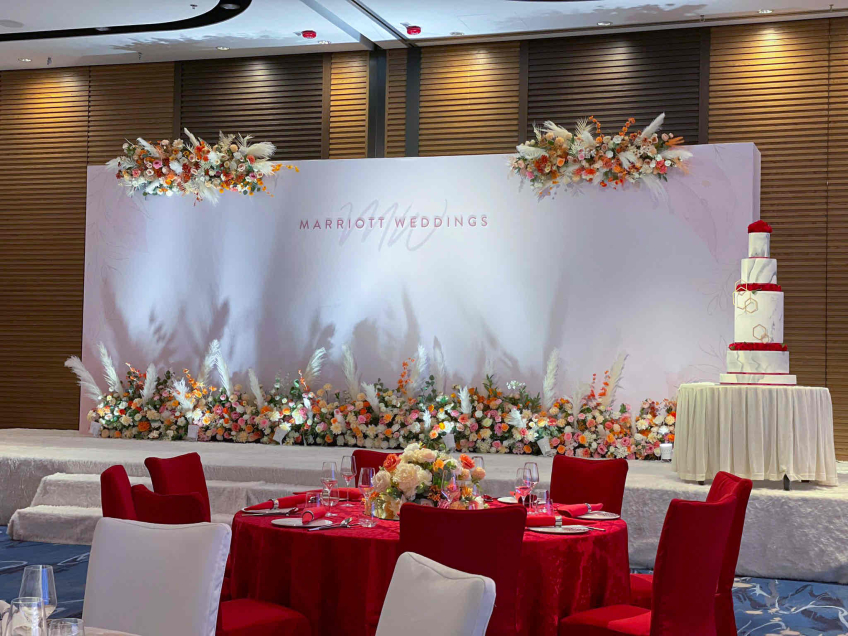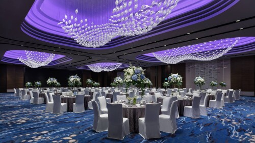 香港海洋公園萬豪酒店宴會廳以海洋為主題,擁有無柱型設計和時尚別緻的佈置,並配備先進的多媒體設備、大型LED背景屏幕和燈光調控設備,為賓客帶來全方位的感官享受,細味新人的每個精彩時刻。 宴會廳佔地超過 1,200平方米,可筵開最多80席圓桌;亦可靈活分隔成10至30席的婚宴場地,按準新人預算及賓客人數舉行中小型婚宴,配上個性化的場地佈置,展現非凡氣派。
