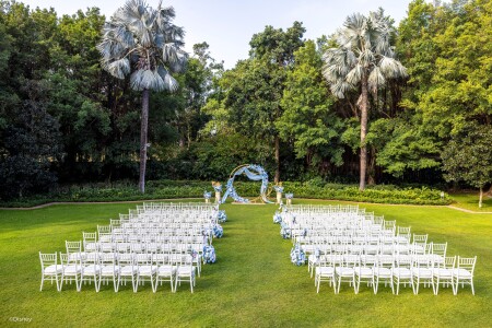 香港海洋公園萬豪酒店宴會廳以海洋為主題,擁有無柱型設計和時尚別緻的佈置,並配備先進的多媒體設備、大型LED背景屏幕和燈光調控設備,為賓客帶來全方位的感官享受,細味新人的每個精彩時刻。 宴會廳佔地超過 1,200平方米,可筵開最多80席圓桌;亦可靈活分隔成10至30席的婚宴場地,按準新人預算及賓客人數舉行中小型婚宴,配上個性化的場地佈置,展現非凡氣派。 喜歡戶外的您,不妨考慮舉辦一場被蔚藍天空和翠綠山巒環抱的婚禮。戶外園林婚宴花園面積約208平方米,可容納80位賓客就座; 親友可於一望無際的藍天下見證浪漫感人的一刻, 這裡還是寵物友善的證婚場地,讓最愛的毛小孩可參與您的人生大日子。 酒店大堂更設有全港獨有高達16米的圓柱形水族館,準新人可以在獨特背景前舉行證婚儀式,全港只此一間。而室內婚禮場地亦不受天氣影響,新人和賓客可全身投入海洋婚禮的浪漫氛圍。