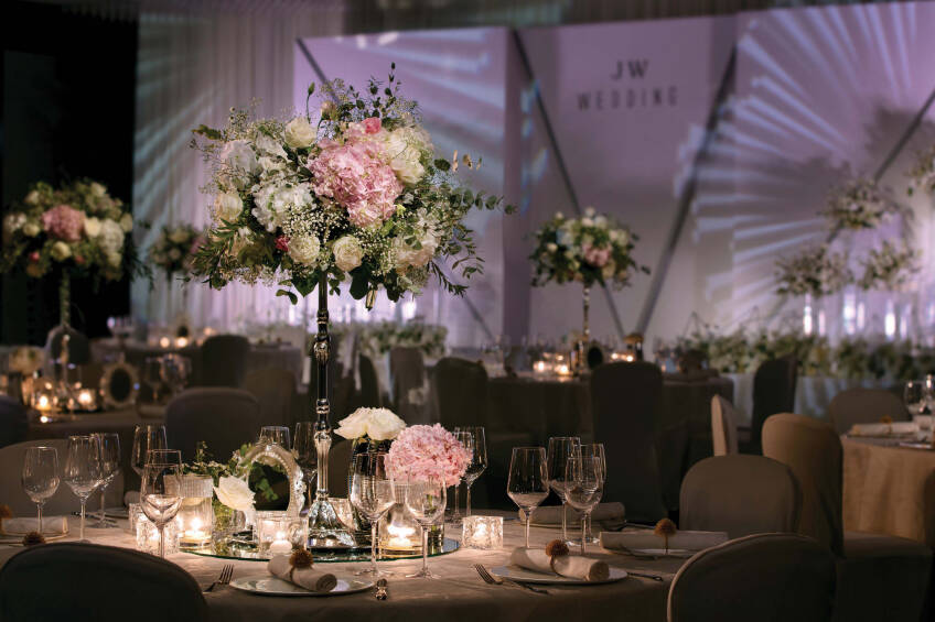 奢華高貴的 JW 萬豪宴會廳(8,142平方呎 / 756平方米)位於酒店3樓,採用無柱式設計,特高15 呎樓底,可筵開56席,成就容納超過 600 人的頂級宴會。宴會廳以奢華典雅的意大利吊燈裝飾,並設置先進的照明技術,營造多種獨特燈光效果,其12 米闊、3 米高的高清液晶體背景幕牆更可顯示相片、影片及現場直播,為婚宴提供無與倫比的視覺效果。宴會廳毗鄰更有4間設計時尚的多功能會議廳,分別為Admiralty、The Peak、Queensway 及Victoria,提供靈活調配的空間,可供新人用作新娘房、麻雀房或休息室等。