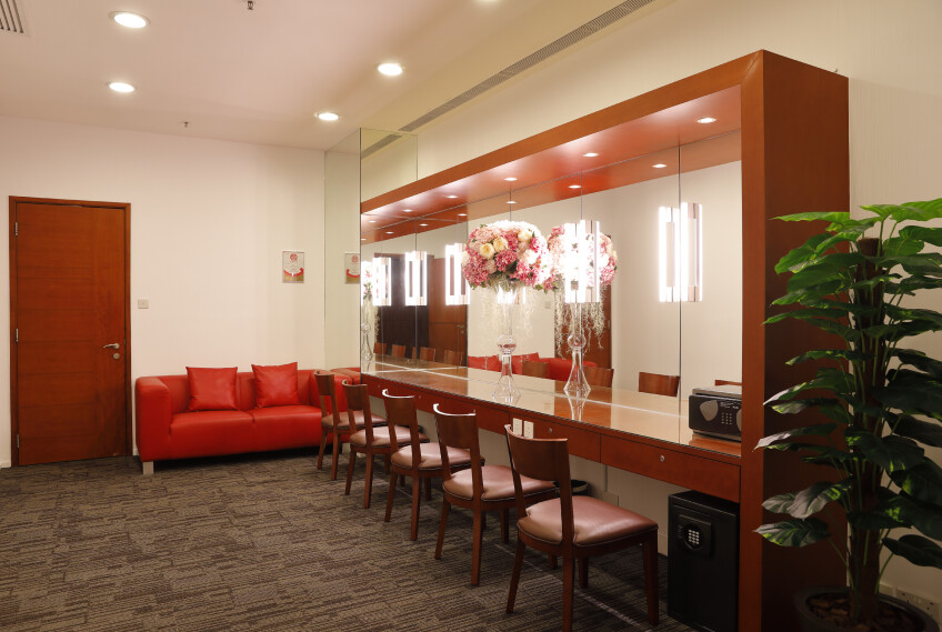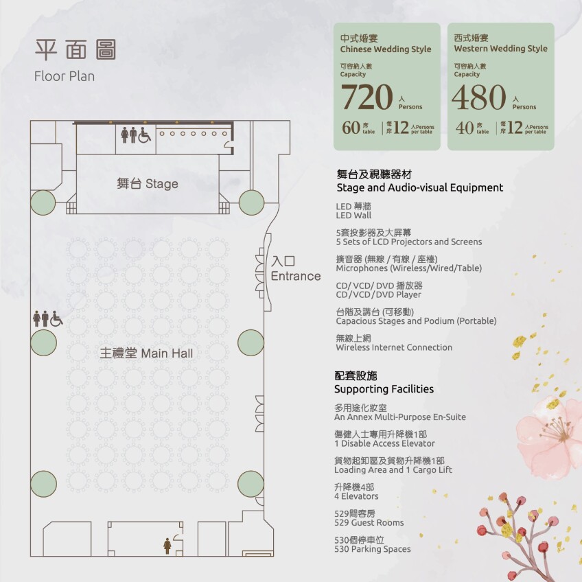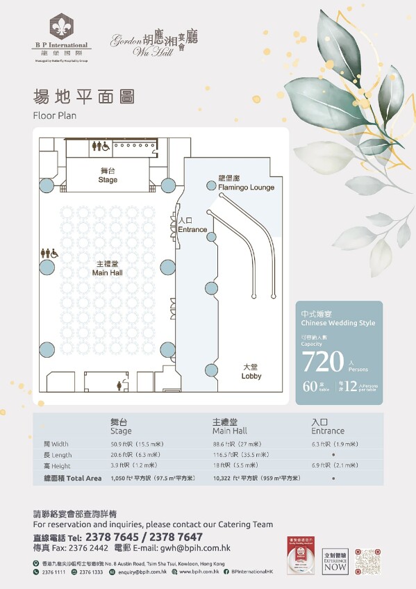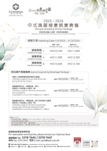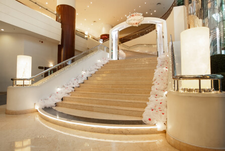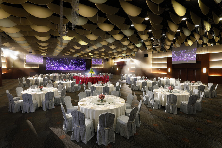 胡應湘宴會廳佔地1,060平方米,樓高6米,採用無柱式設計,同時配備大型LED幕牆,瑰麗堂皇,氣派宏偉。獨特新穎的天花設計,配合相連大堂典雅的迴旋雲石階梯,營造出獨有型格和優雅風采。階梯兩側以輕薄飄逸的白色雪紡點綴,時尚的設計讓新人成為注目的焦點,亦令婚宴更具格調。