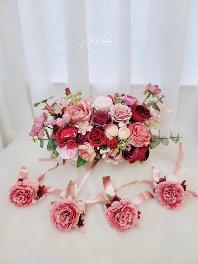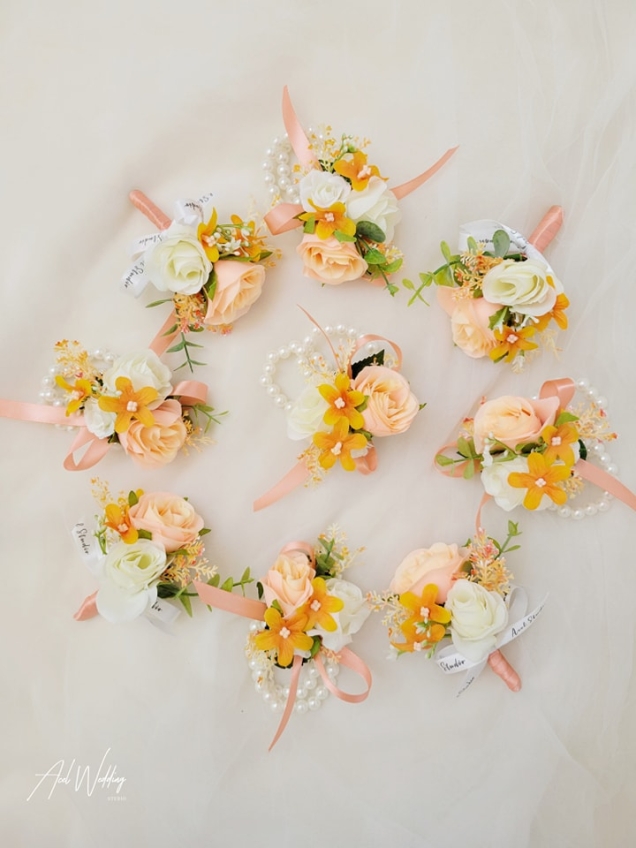 - •手腕花設計考究,運用蜜桃色系、暖色調,搭配蝴蝶結緞帶和珍珠點綴,展現精緻層次感。