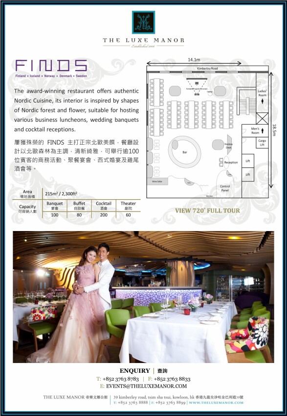FINDS是香港首間及唯一一間正宗的北歐海鮮餐廳及酒吧。餐廳由來自芬蘭獲獎無數之星級名廚Jaakko Sorsa主理,並提供多款創新分子料理雞尾酒。FINDS的設計現代優雅,彷如置身於北歐的森林,地方寬敞。最適合舉行婚宴、室內或室外雞尾酒宴會、婚禮前新郎兄弟團 / 新娘姊妹團派對及各類型的聚餐活動。多元化的活動場地包括用膳、酒吧、會客廳、半私人空間及開放式的露台,提供精緻美食。