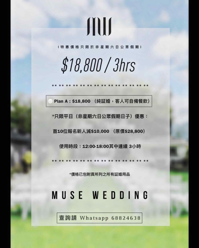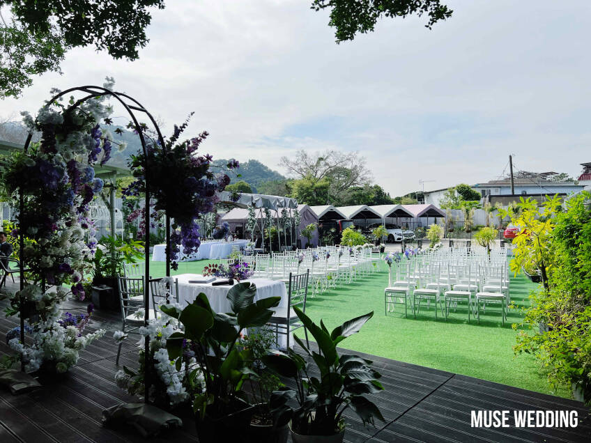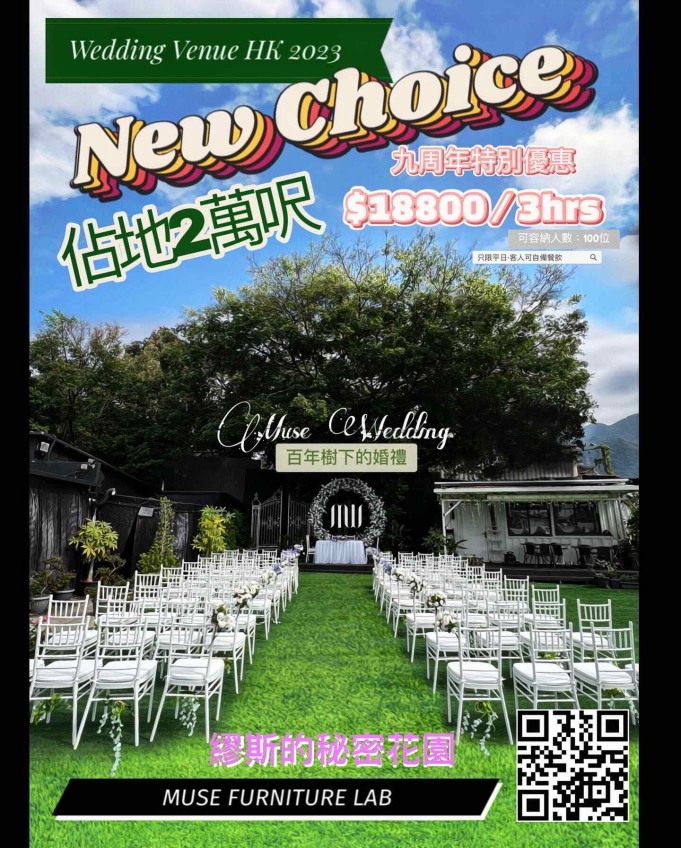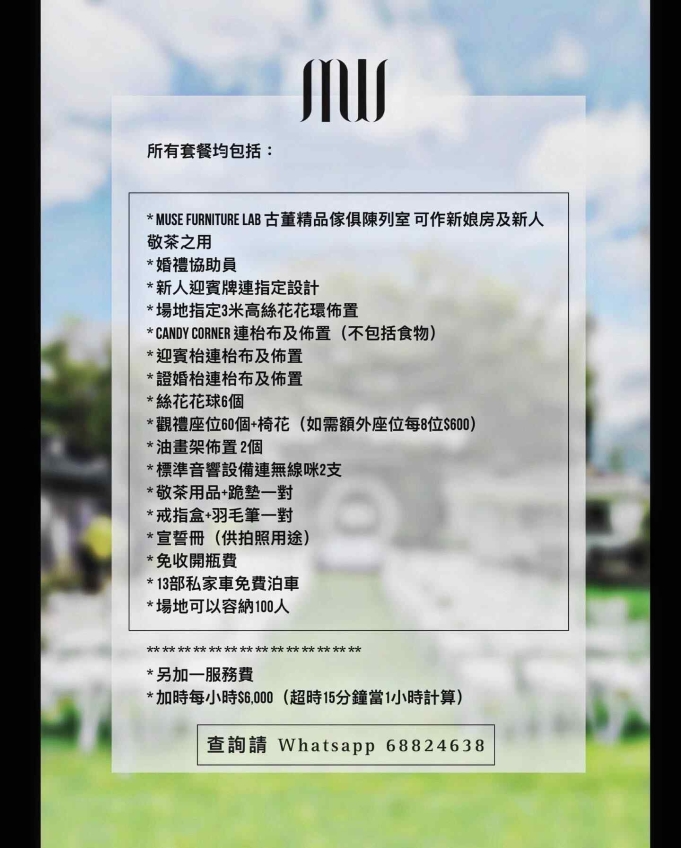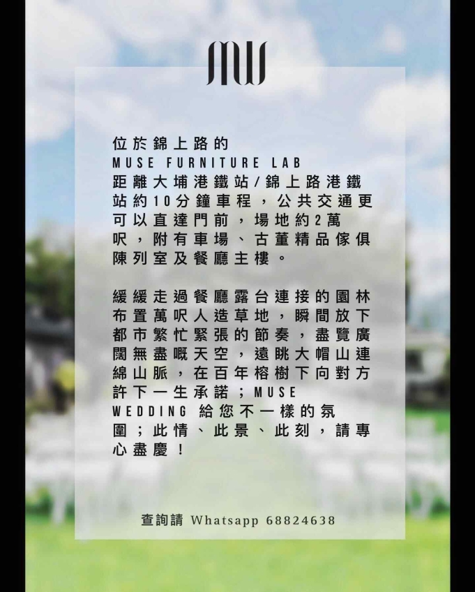 位於錦上路的 MUSE FURNITURE LAB 距離大埔港鐵站/錦上路港鐵站約10分鐘車程,公共交通更可以直達門前,場地約2萬呎,附有車場、古董精品傢俱陳列室及餐廳主樓。 緩緩走過餐廳露台連接的園林布置萬呎人造草地,瞬間放下都市繁忙緊張的節奏,盡覽廣闊無盡嘅天空,遠眺大帽山連綿山脈,新人在百年榕樹下向對方許下生承諾;MUSE WEDDING給您不一樣的氛圍;此情、此景、此刻,請專心盡慶! 查詢請Whatsapp 68824638