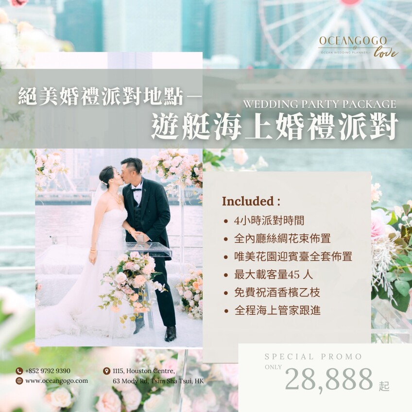 OCEANGOGO為全港首間專業的海上管家公司,提供多樣化海上活動,擁有超過10年航海經驗,50多個遊艇可供選擇。同時具備專業婚禮策劃經驗,提供一系列婚禮服務,由求婚、婚攝、單身派對,到証婚及婚宴,都能為準新人度身訂造完美的海上婚禮。