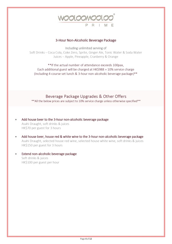 位於尖沙咀的Wooloomooloo Prime,坐擁270度璀璨的維港海景。餐廳能容納176人,加上雅緻的裝潢,最適合舉辦一個簡約而浪漫的下午婚宴。